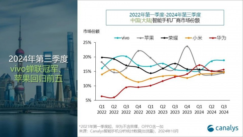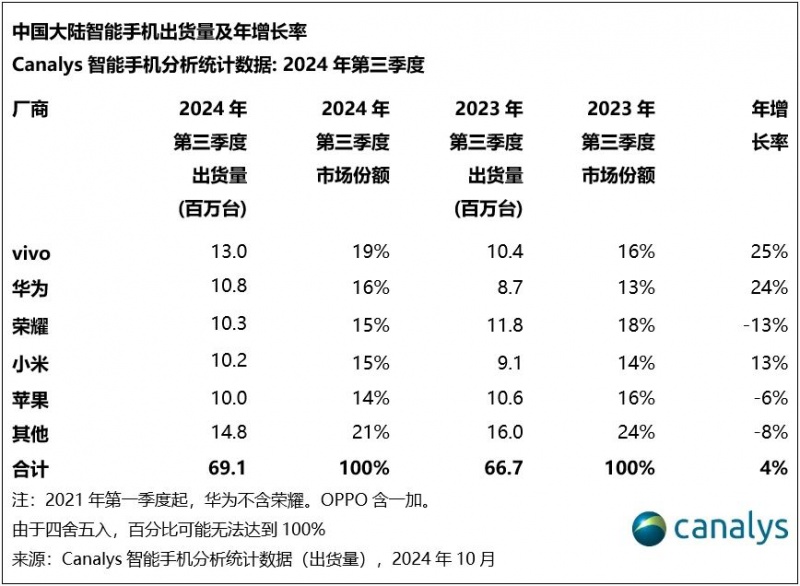 2024年第三季度,中国大陆智能手机市场在暑期及开学购机旺季的推动下延续了反弹的步伐,出货量同比增长4%至6910万台,vivo蝉联榜首,市场份额高达19%,vivo中端新品的发布稳固了线下渠道的销售,而线上渠道持续拓展,整体出货量同比增长25%至1300万台,华为以1080万台的出货量和16%的份额位居次席,同比增长24%,通过积极的渠道策略维持旗舰产品的销售,荣耀以1030万的出货量排名第三,尽管折叠屏产品获得热捧,整体仍同比下滑13%,扩张期遇挑战,小米排名更进一步,达到第四,份额为15%,其在人,车,家生态策略的驱动下圈定了更广泛和稳固的用户群体,出货量同比增长13%至1020万台,尽管苹果出货量同比下跌6%,但重回第五,在Apple Intelligence服务暂时缺位的情况下,iPhone 16系列的需求仍将展现出韧性, 午夜影院。