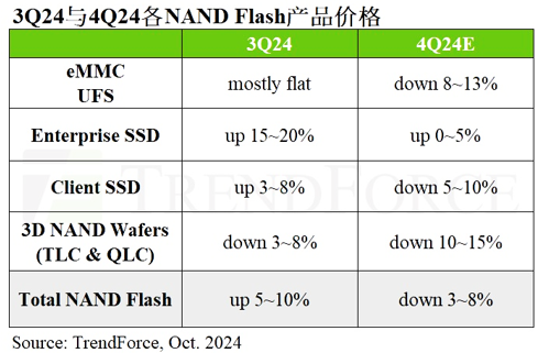根据TrendForce集邦咨询最新调查,NAND Flash产品受2024年下半年旺季不旺影响 午夜影院,wafer合约价于第三季率先下跌,预期第四季跌幅将扩大至10%以上,模组产品部分,除了Enterprise SSD因订单动能支撑,有望于第四季小涨0%至5%,PC SSD及UFS因买家的终端产品销售不如预期,采购策略更加保守,TrendForce集邦咨询预估,第四季NAND Flash产品整体合约价将出现季减3%至8%的情况, 。