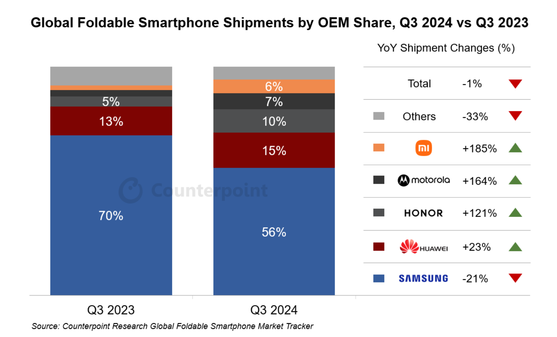 根据Counterpoint Research最新的全球折叠屏智能手机市场追踪报告 午夜影院,在经历连续六个季度同比增长后,2024年第三季度全球折叠屏智能手机出货量同比下降1%,这是该市场历史上首次在第三季度出现下滑,主要原因是三星全新Galaxy Z6系列表现平淡, 。