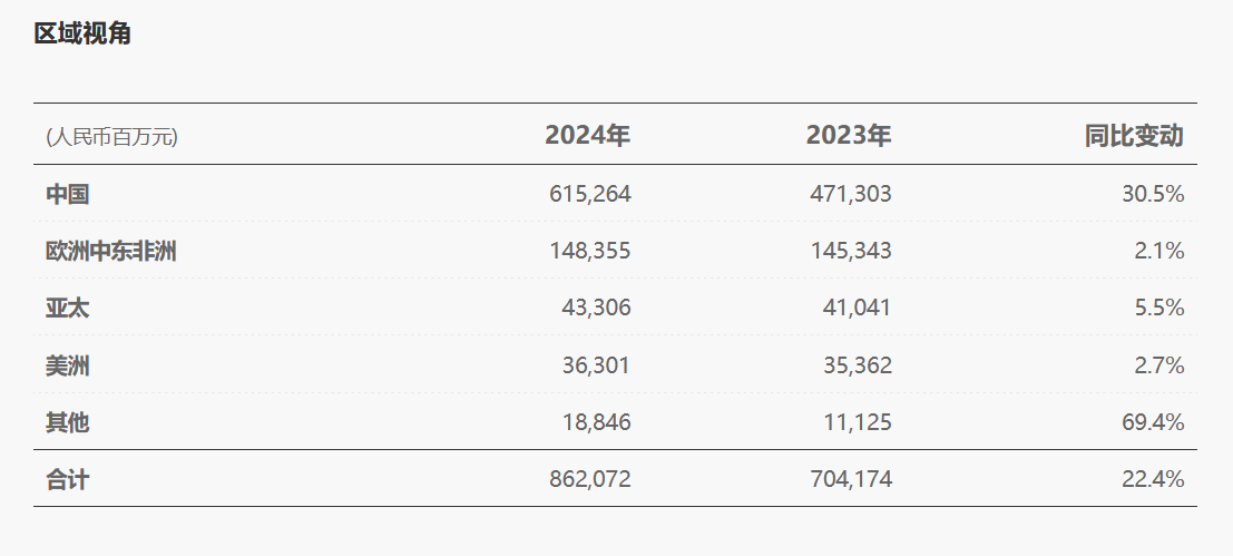 从区域营收来源来看,华为2024年中国区营收为6152,64亿元,同比增长30,5%,在总营收当中占比高达71,37%;欧洲中东非洲地区的营收为1483,55亿元,同比增长2,1%;亚太地区营收为433,06亿元,同比增长5 午夜影视资源,5%;美洲地区营收为363,01亿元,同比增长2,7%。 。