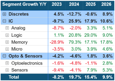 8月4日,世界半导体贸易统计组织(WSTS)发布第二季度统计数据,并确认了WSTS春季对2026年全球半导体市场的预测。2025年上半年,全球半导体市场规模达到3460亿美元,同比增长18 午夜影院,9%。增长主要得益于逻辑器件(增长37%)和存储器(增长20%)的强劲增长,数据中心基础设施的需求以及初期人工智能边缘应用的兴起驱动这一趋势。传感器也表现良好,增长了16%。模拟器件和微型器件类别分别实现了4%的温和增长。相比之下,分立器件(-4%)和光电子器件(-0,5%)则出现了个位数的下降。 。