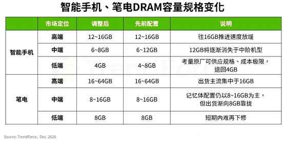 TrendForce集邦咨询指出,“缩减规格配置”或“暂缓升级”已成智能手机,笔电品牌平衡成本的一项必要手段 深夜在线电影,其中以成本占比较高的DRAM修正较明显,预料高阶,中阶产品的DRAM容量规格将分别向该市场的最低标准集中,放缓提升速度,至于低阶市场则是受创最深的价格带,以手机为例,2026年退回以4GB为主,低价笔电因受限于处理器搭配及操作系统需求,DRAM配置短期内难再下修, 。