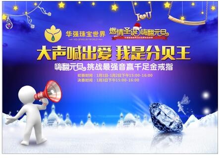 元旦假期期间,华强珠宝世界约你挑战最强音 午夜高清播放,喊出你的压抑,喊出你的期望,喊出你的心声,报名参与即可获得精美礼品,按照声音分贝获得排名,冠军将获得千足金戒指一枚, 。